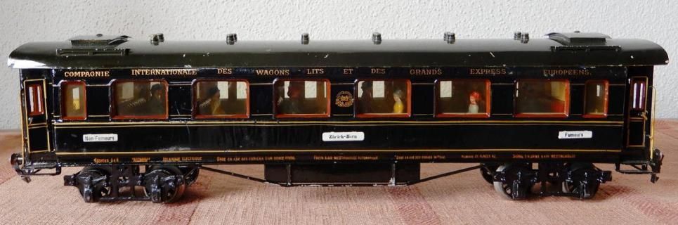 Modell: CIWL Personenwagen, 4-achsig, klassische blaue Lackierung, mit Zuglaufschild "Zürich - Bern", Beschriftungen "Non Fumeurs"