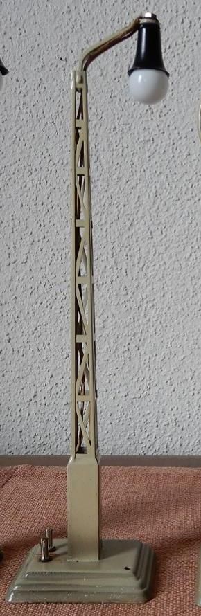 Modell: Gittermast-Lampe, Blech, graubeige, auf Vierecksockel, Höhe 30 cm